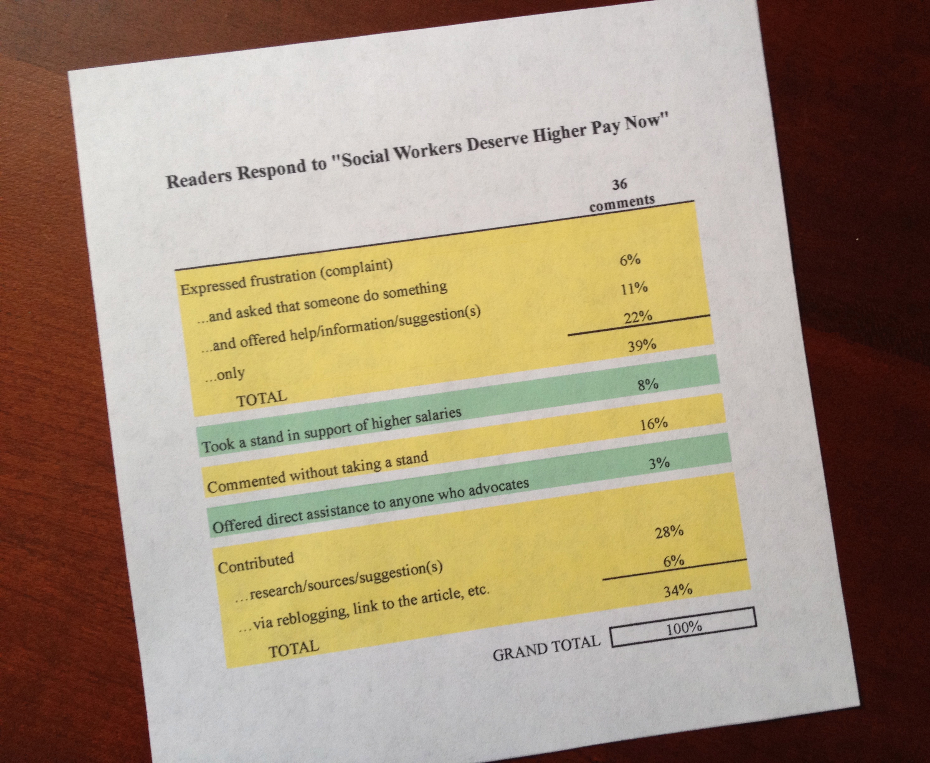 • 8% took a stand in support of higher salaries for social workers (without making a complaint, as such; e.g., “It is high time social workers received compensation that appropriately reflects their contributions to society.”)